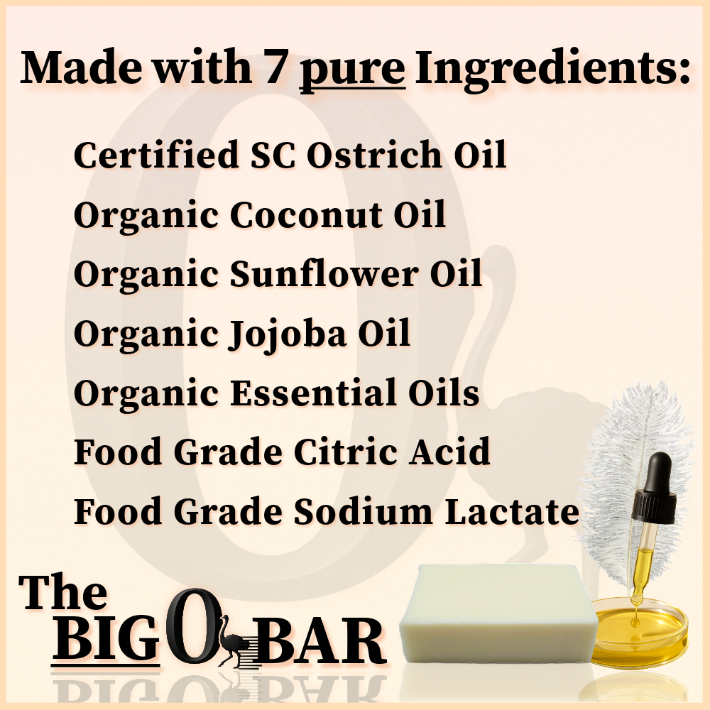 Infused with nearly an ounce of ostrich oil, rich in omega 3, 6 & 9, this bar mirrors your skin’s own oils to deliver deep, lasting moisture—often eliminating the need for lotion. Its velvety lather restores without stripping, revealing calm, soft, radiant skin.